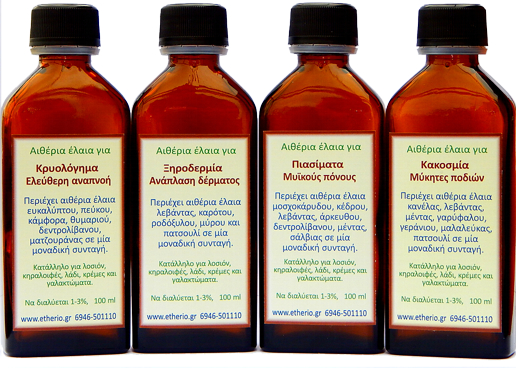 Στη γκάμα μας περιλαμβάνονται μείγματα φυσικών αιθέριων ελαίων για την ξηροδερμία, τα εγκαύματα, την απολύμανση και επούλωση των τραυμάτων-κατακλίσεων, τους μυϊκούς πόνους, το κρυολόγημα, τις φλεγμονές, την ακμή, την ψωρίαση, τις ψείρες, το έκζεμα, τα ακάρεα, τους κηρσούς και την κακοσμία των ποδιών.