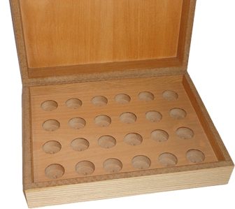 Κασετίνα 24 αιθερίων ελαίων. Η κασετίνα έχει θήκες για 24 διαφορετικά αιθέρια έλαια τα οποία επιλέγετε από τη συλλογή μας. Υλικό κατασκευής γιασενίτης επικολλητός με μεντεσέ. Τύπος ασφάλισης κούμπωμα μεταλλικό. Βάρος 1135 gr, ύψος: 7,5 cm, πλάτος: 24 cm, βάθος: 19 cm. Επαγγελματική λύση για αρωματοθεραπευτές, αισθητικούς και φυσιοθεραπευτές.